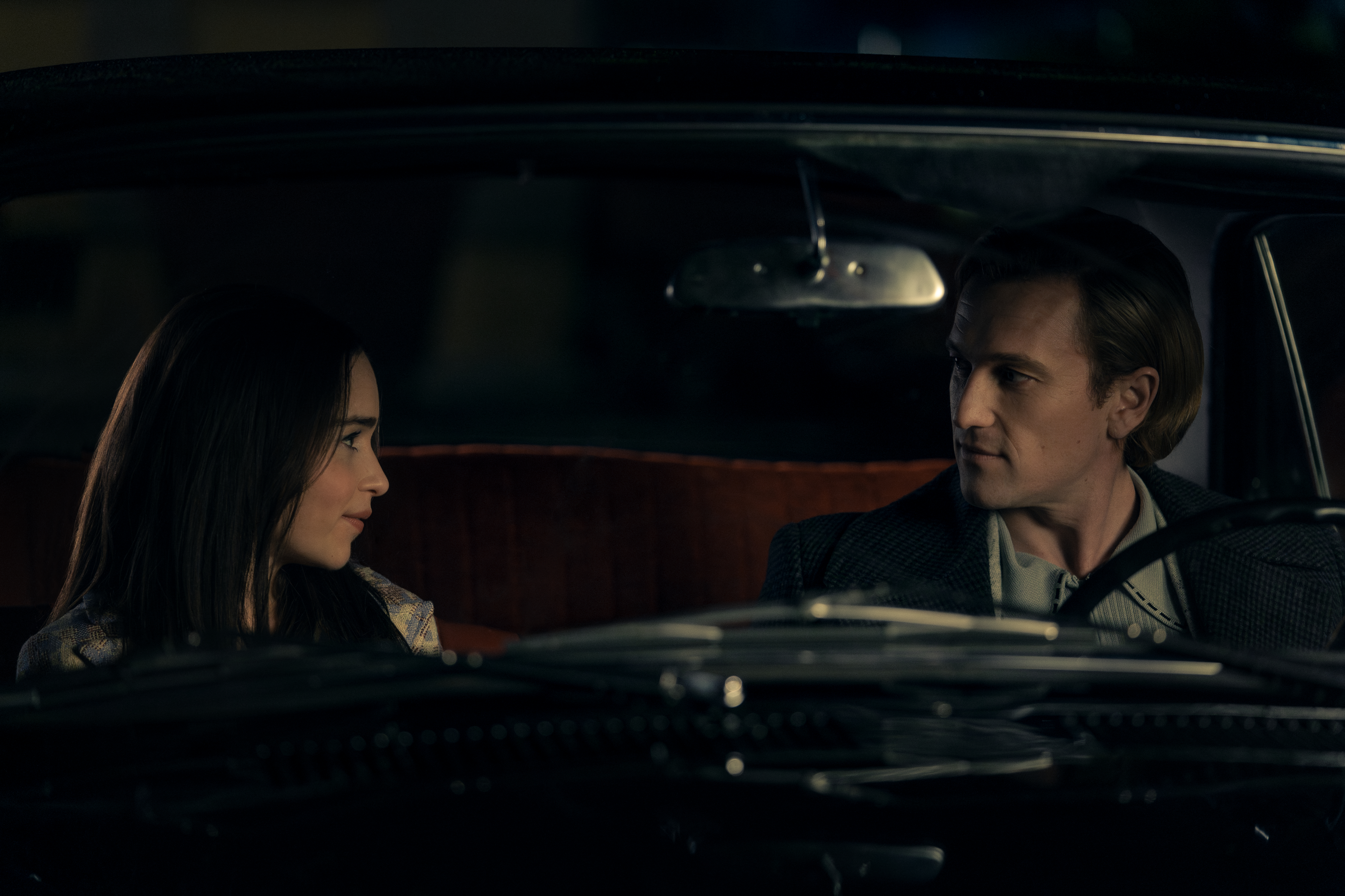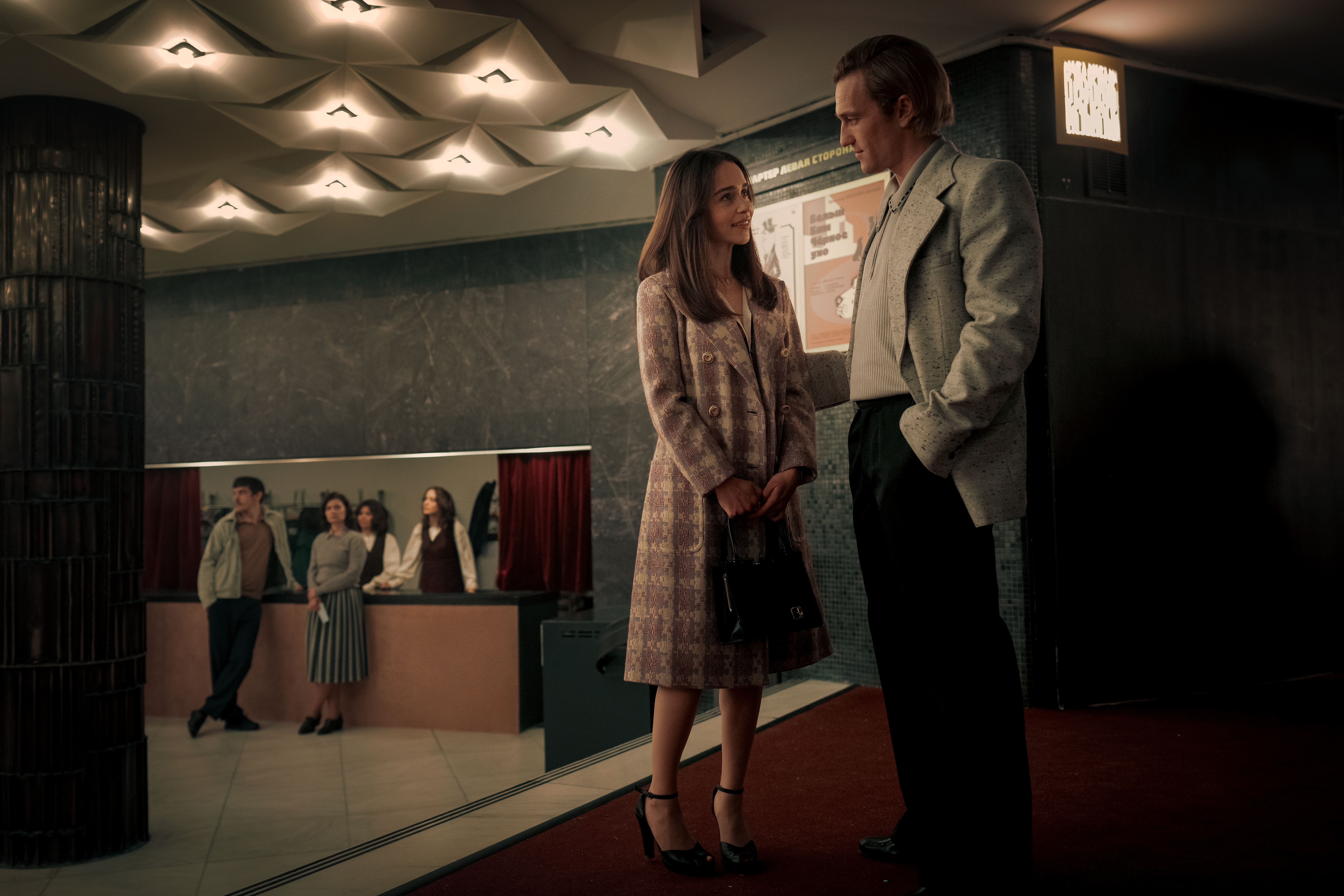 PONIES — Pictured: (l-r) Emilia Clarke as Bea, Artjom Gilz as Andrei — (Photo by: David Lukacs/PEACOCK)