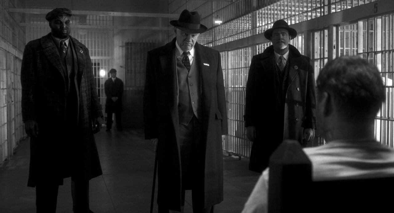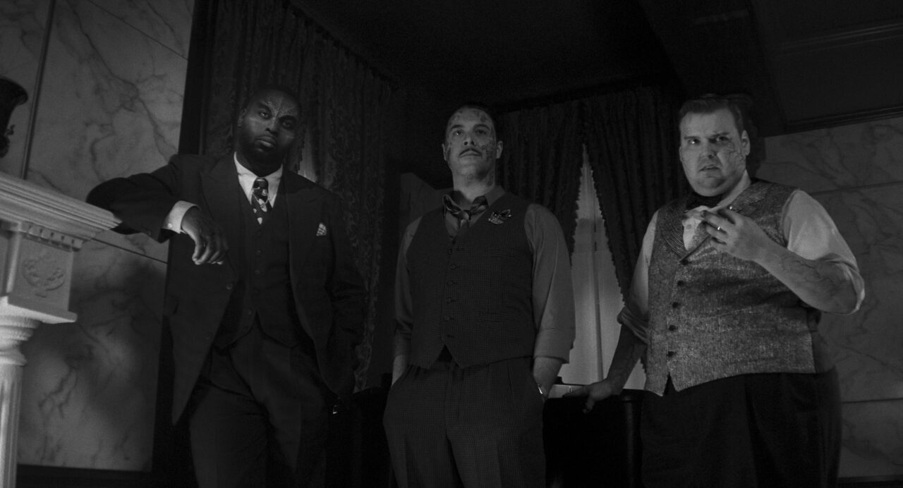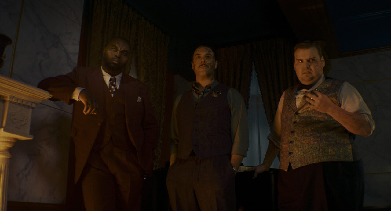 Lonnie/Tombstone (Abraham Popoola), Finn Byrne/Silvermane (Brendan Gleeson), and Flint Marco/Sandman (Jack Huston) in SPIDER-NOIR